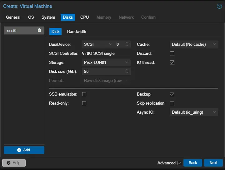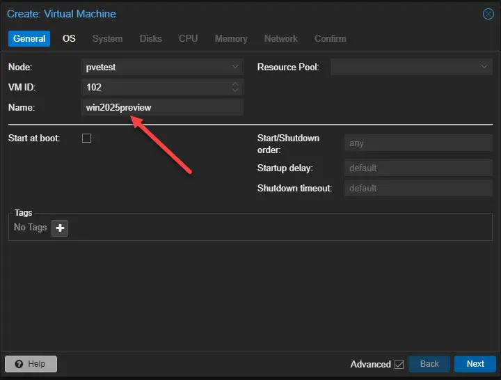 After we have uploaded the ISO images we need to a storage location in Proxmox that we can retrieve from, we can create the actual virtual machine configuration that will be used for installing Windows Server 2025.