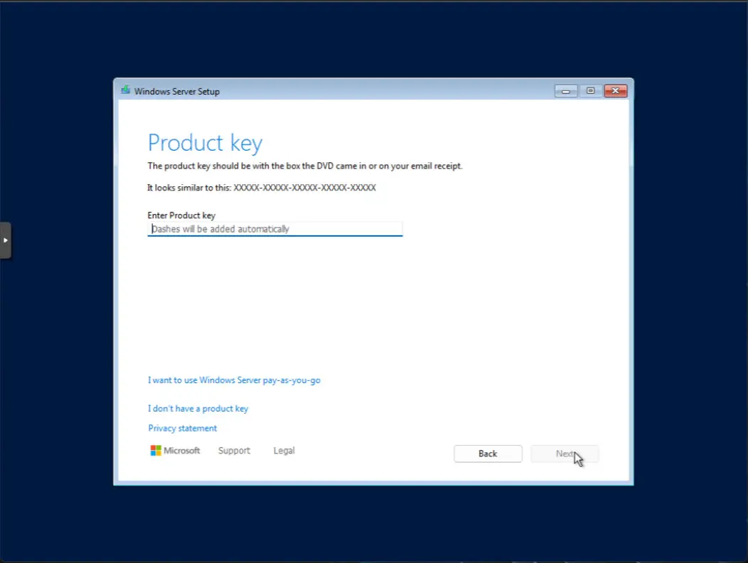 Enter a product key if you have one. However, if you are using the Evaluation copy or you just want to trial out the installation, you can skip this step and move on. Just select I don’t have a product key.