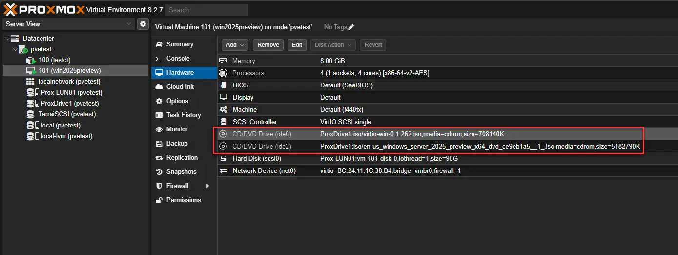 You will want to mount the ISO images in Proxmox to (2) different CD-ROM drives. We will need both the Windows Server 2025 ISO mounted and also the VirtIO disc ISO mounted in the Proxmox virtual machine.
