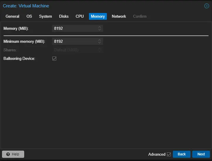 On the memory tab, configure the memory settings for the new Windows Server 2025 virtual machine in Proxmox.