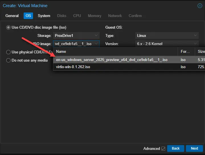 Select from the ISO images you have available. On the select ISO images dropdown, you will see the VirtIO drivers ISO as well but just select the Windows Server 2025 ISO.