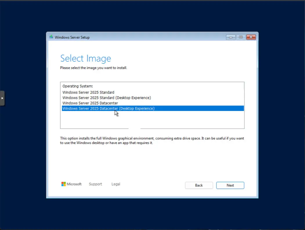 Select the image you want to install. Here we are selecting Windows Server 2025 Datacenter (Desktop Experience) which will install the GUI.