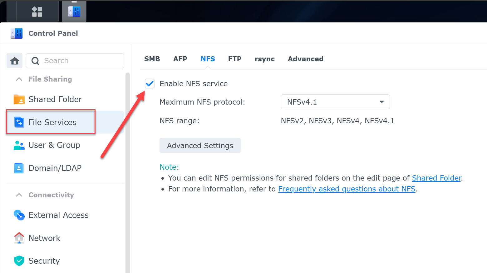 Let’s first look at configuring a Synology Drive in Proxmox using NFS. First things first. On the Synology side of things, you need to Enable NFS service under the File Services menu. Place a check in the checkbox. Note the maximum nfs protocol setting. This defines the maximum NFS protocol that is supported to connect to the shared folder. I didn’t have any issues settings this to NFSv4.1 as it is backwards compatible with the range you see listed.