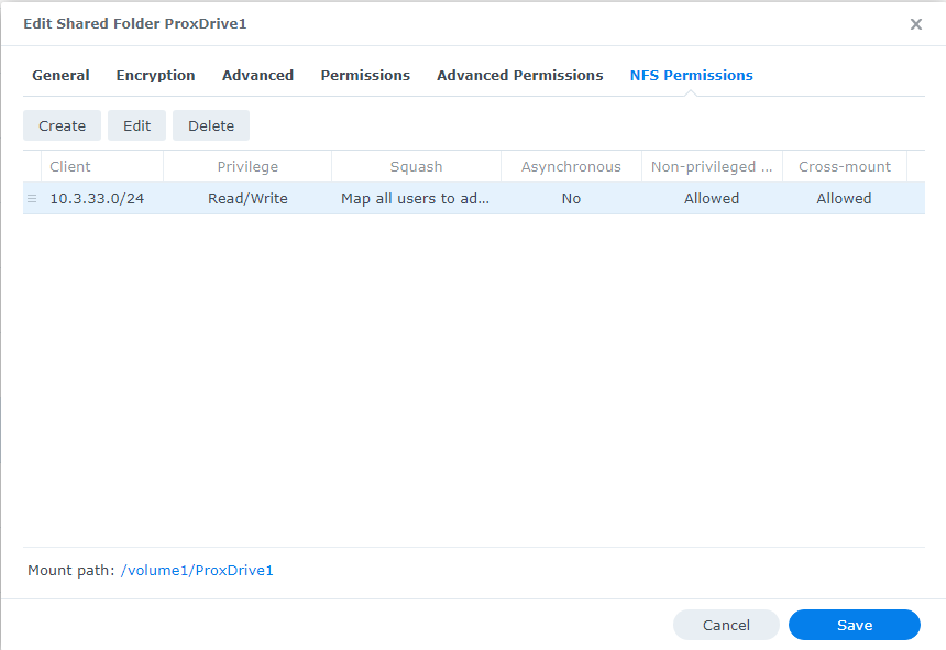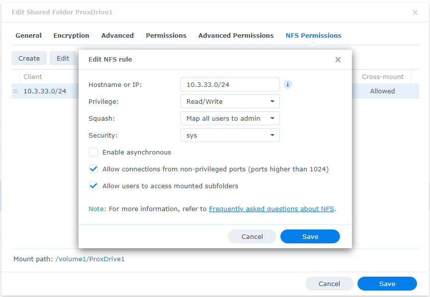 Below, I didn’t include the volume1 in the path and it gave me an access denied. Also, give attention to the NFS rules as a culprit if you get access denied. You may need to squash user permissions to a specific level using the settings shown above, depending on how secure you want to make your NFS connection.