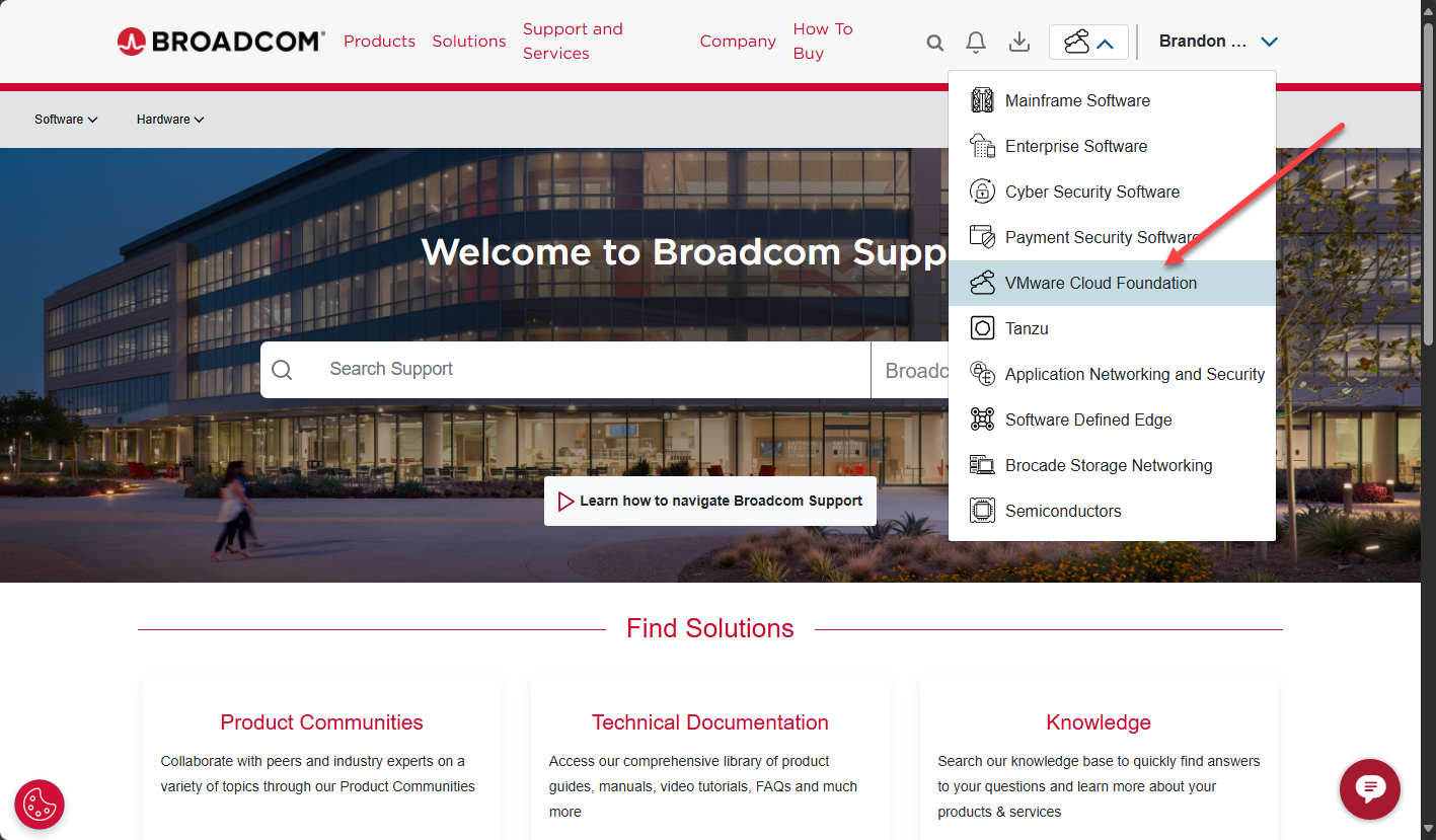 Below, I will show you the steps to get to your download. Log into the Broadcom support website: support.broadcom.com. Then click the dropdown to the left of your name and select VMware Cloud Foundation.