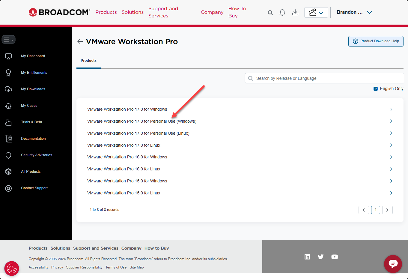 Click the VMware Workstation Pro search result and then select the license type you are downloading. Here I am selecting the link for VMware Workstation 17.0 for Personal Use (Windows).