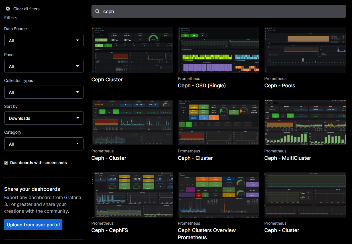 So, you may be thinking, how do I get all the visualizations that I want to visualize the Prometheus data? Well, the Grafana community dashboards will save you a lot of the time and effort. You can go to the community site here: https://grafana.com/grafana/dashboards and search for Ceph. This will bring up a wealth of already published dashboards for your Ceph data.