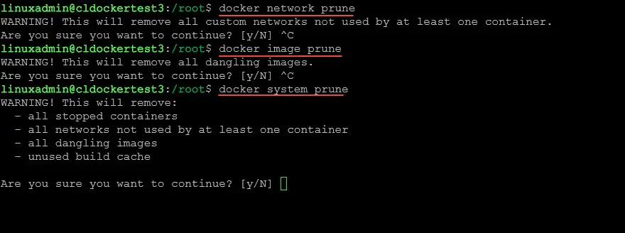 However, if we combine “prune” with other docker components like network, image, or system, we will see the following output: