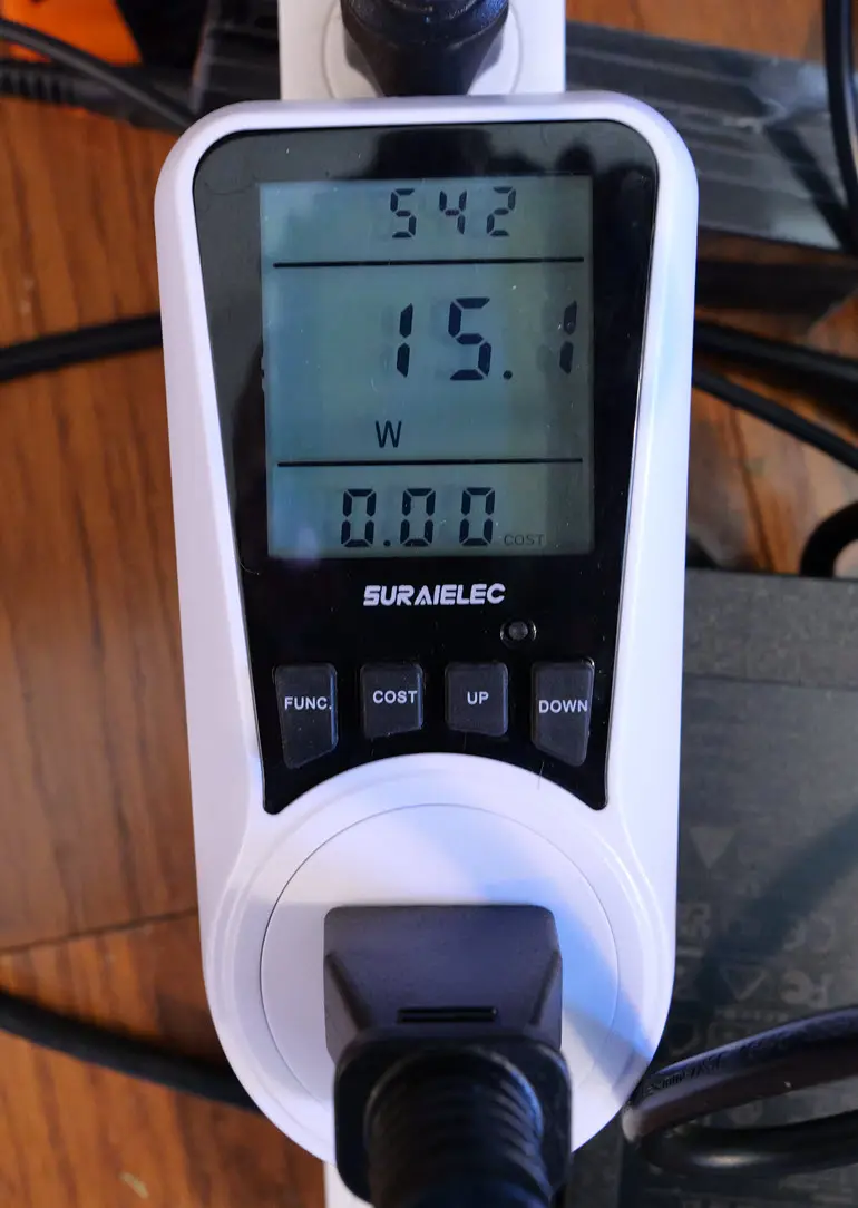 After the unit booted up and settled down without any VMs running, this is roughly the average power draw. I saw it dip to around 14.1 and go up to 16.5 or so, but that is the range you will see at CPU idle.