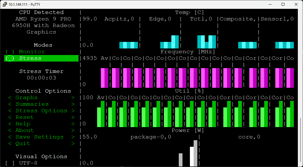 Using the Linux stress utility in Proxmox along with S-TUI, I created a synthetic 100% CPU workload and measured around 73.5 watts of power draw at 100% CPU.