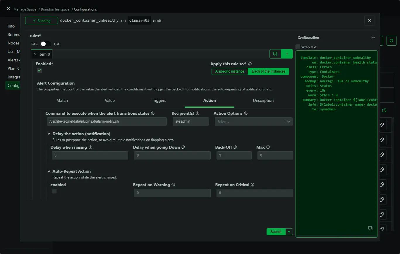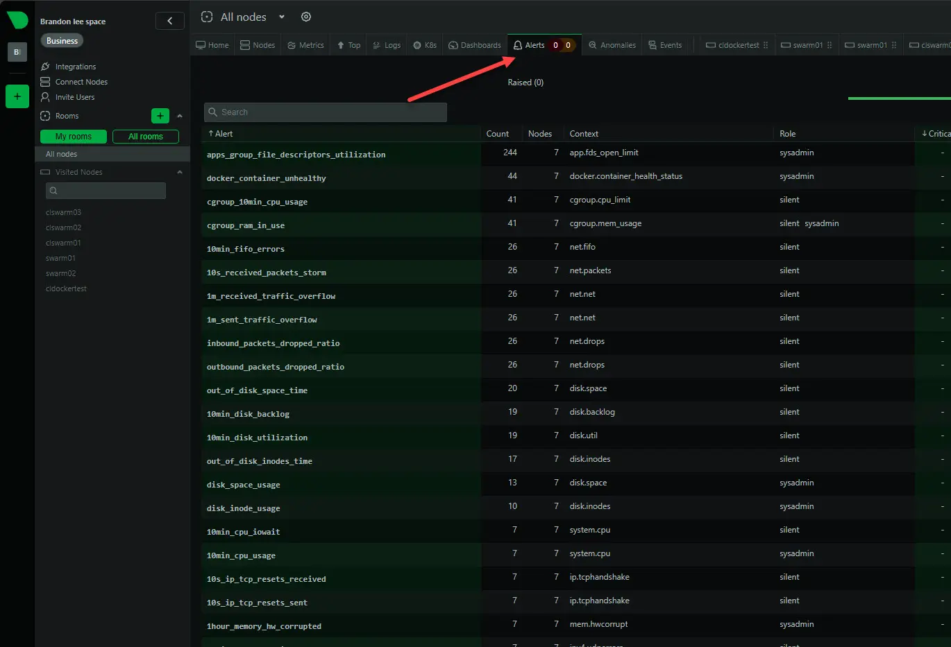 One of the great features of Netdata I think is the built-in alerts. While you can customize and create your own alerts, so far I have found that most of the in-the-box alerts are just what I need. You can view the alerts from the alerts tab in your All nodes view.