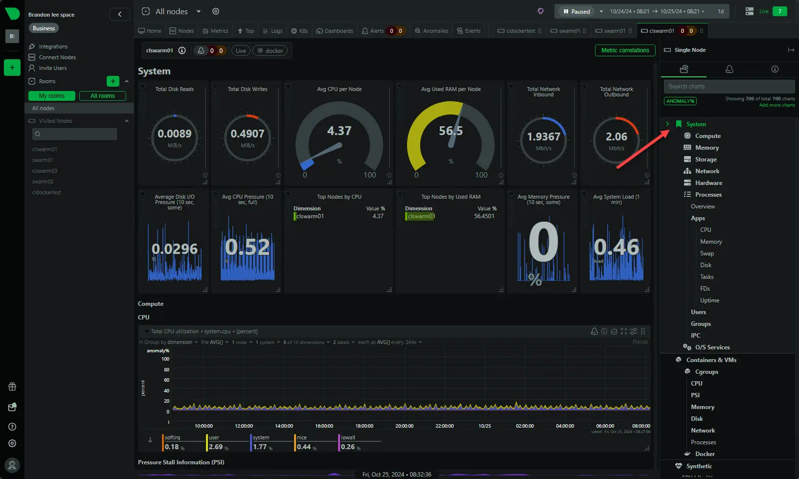 Below, you see a system overview of a Docker container host, including compute, memory, storage, network, hardware, processes, etc.