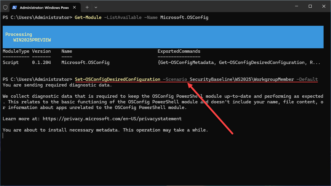 There are a few commands that we need to run to get OSConfig installed. I am running this on a Windows Server 2025 preview build in the lab environment.