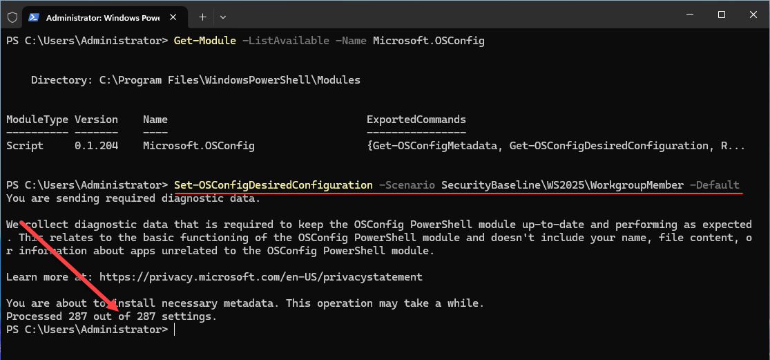 Set-OSConfigDesiredConfiguration -Scenario SecurityBaseline\WS2025\WorkgroupMember -Default