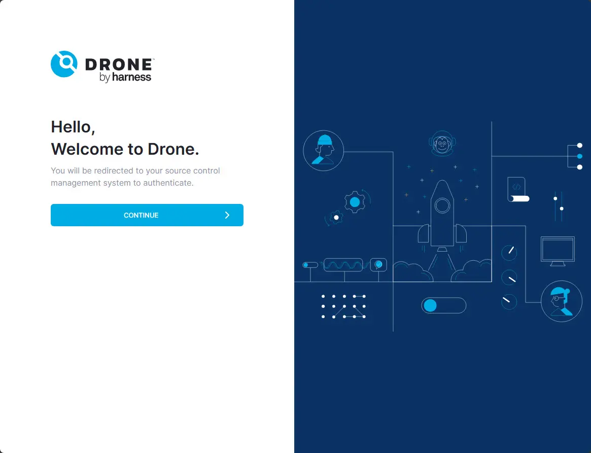 When you connect to Drone, you will see the Continue button that will allow you to authorize your application in Gitea.