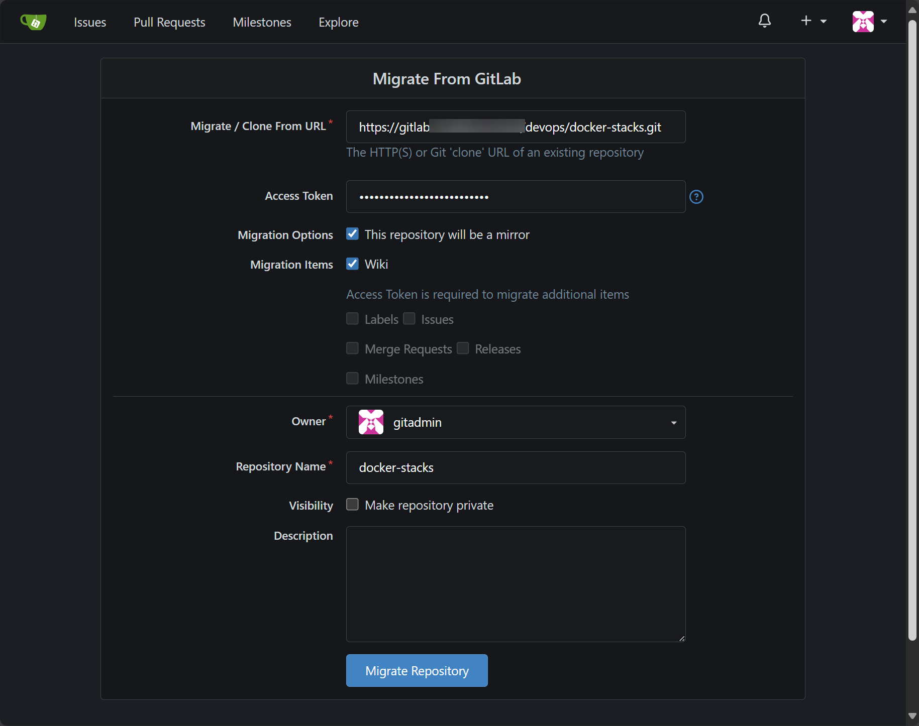 Below is what the configuration screen looks like for migrating GitLab repos over. You will enter your clone URL, Access token, and a few other options. One of the cool things you can check is This repository will be a mirror. This way, when you commit your code to your Gitlab or other solution it will be synced to Gitea. This is a great option for migration as you may want to run both in parallel.