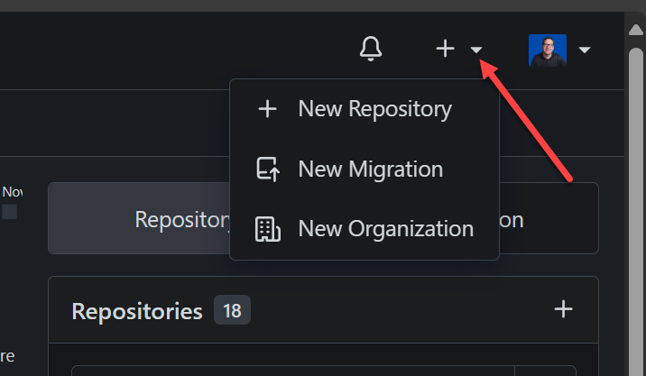 If you have another Git solution you are using like GitLab, Gitea has a built-in mechanism for migrating your repos over. When you click the + and down arrow next to your profile name/pic, you will see the options for: