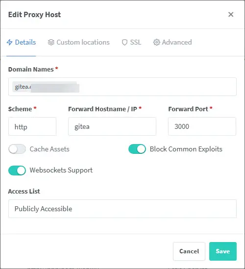 As a side note, once you have your admin user created, you can navigate to your Gitea server address on port 80 of your docker host and log in to the web interface. It is also easy enough to put a reverse proxy in front of your Gitea instance so that you have SSL termination for the solution. Here is a screenshot of my Nginx Proxy Manager configuration: