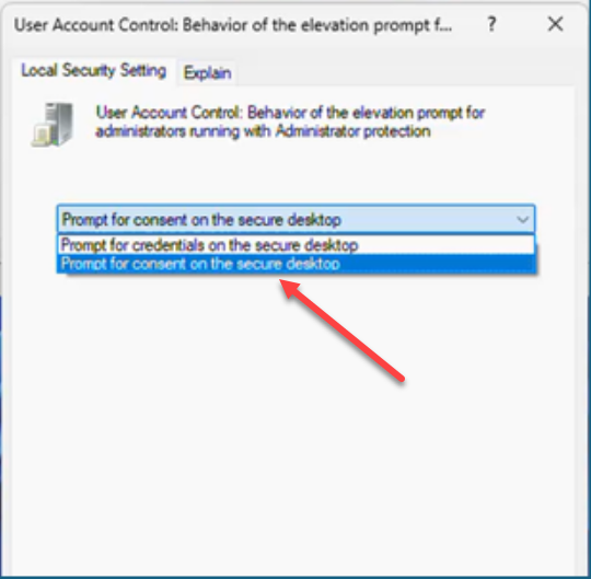 Below, you can see one of the configuration settings for changing the prompt behavior. You can set this to Prompt for consent on the secure desktop.