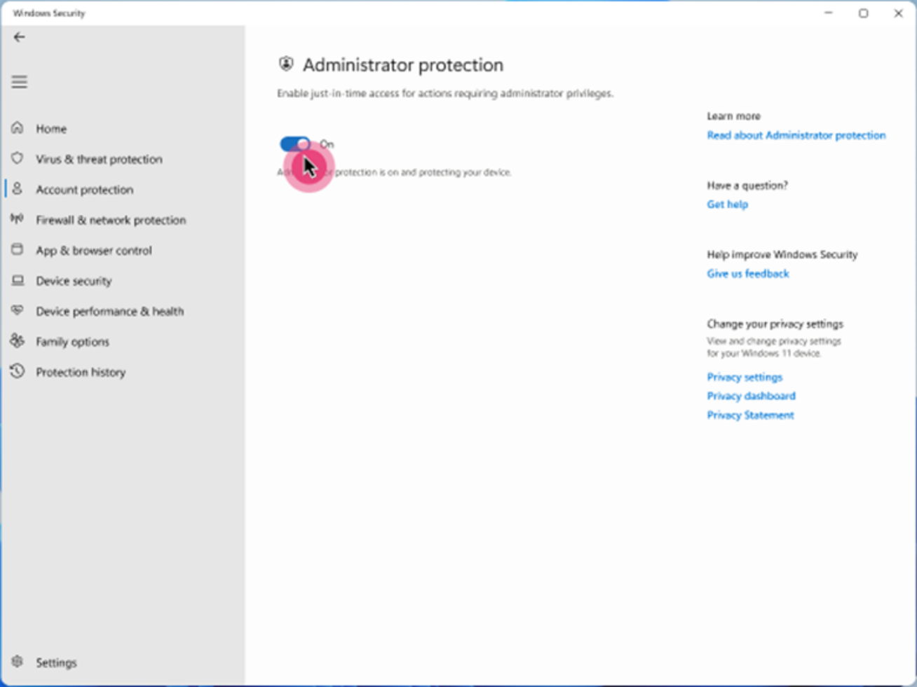 The new Administrator Protection feature is a complete overhaul of how administrator privileges are granted and managed in Windows. It introduces just-in-time (JIT) elevation and the principle of lease privilege. This helps to make it where admin rights are only available when they are absolutely needed and they are tightly controlled instead of wide open.