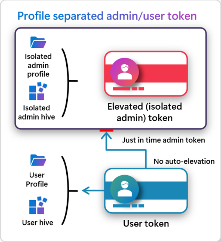 - Session isolation with Profile separation – With the new Administrator Protection feature, the system creates a new hidden and system-generated profile-separated user accounts. This means that malware that has access to the standard user session cannot compromise the elevated session.