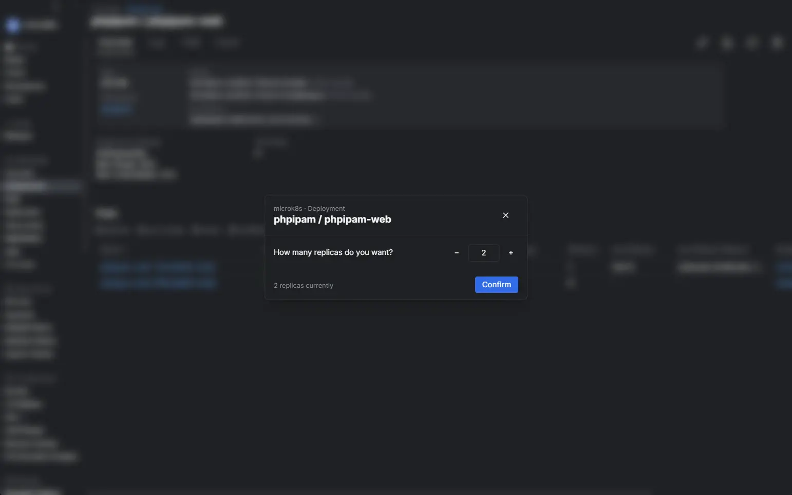 - Scale In/Out:Â This action is available on Deployments, ReplicaSets and StatefulSets.