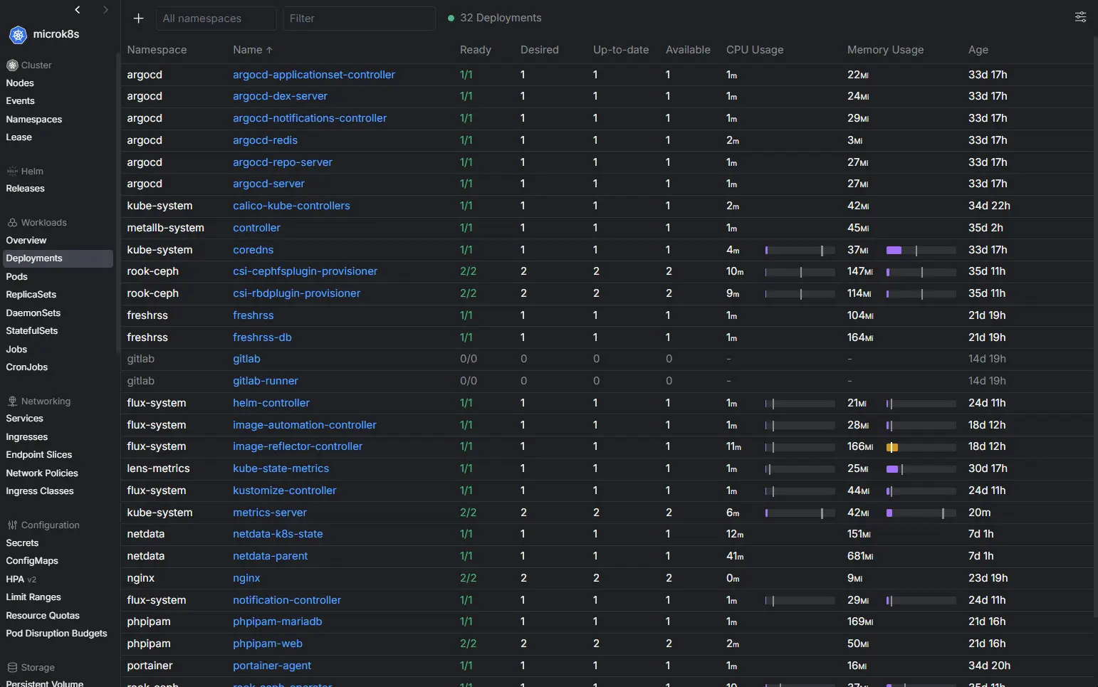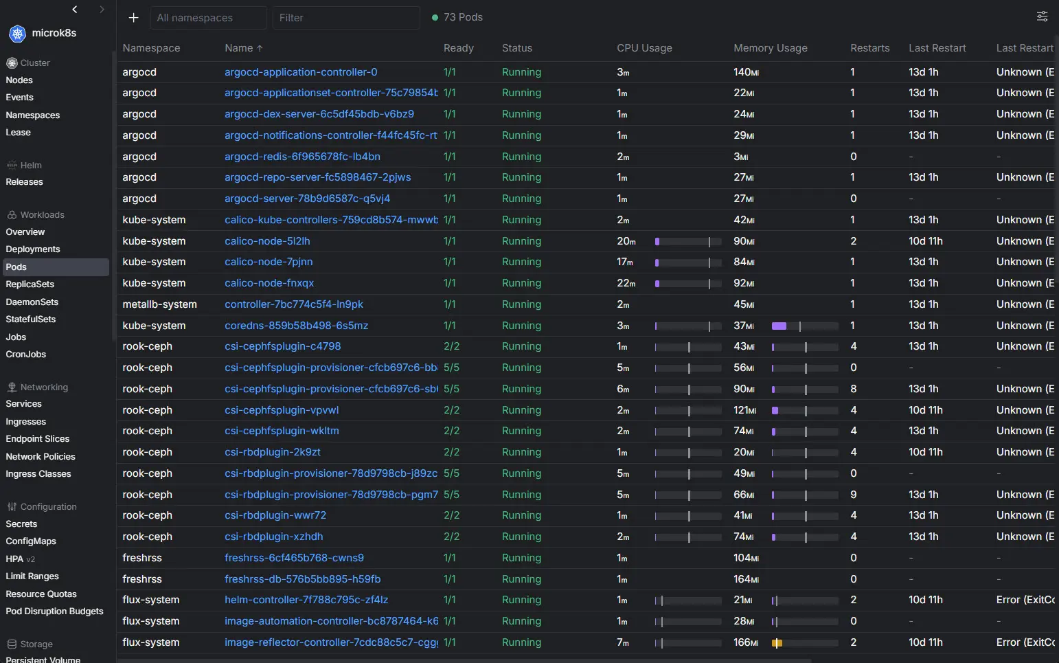 With Aptakube, you can get node metrics in the interface, including CPU and memory metrics for nodes and pods. This is extremely helpful and useful for “at a glance” health overviews. Unlike Lens which has a “cluster settings” that you can toggle for metrics, Aptakube directs you to install the metrics-server which you can find here: kubernetes-sigs/metrics-server.