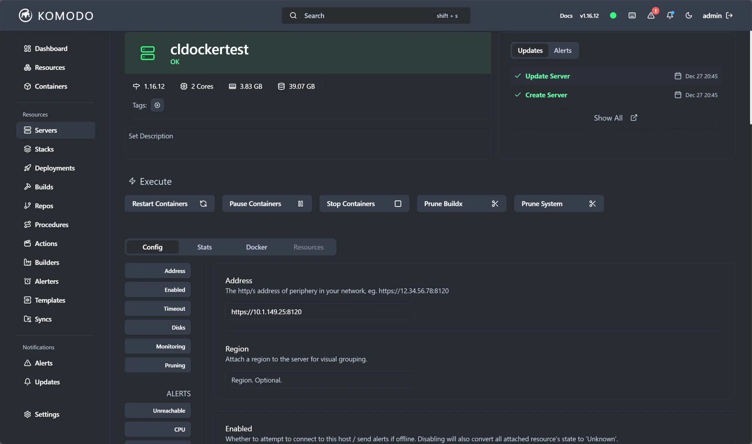 Below is a view of the server dashboard once you click on a server. You can see a wealth of information here. You also have the ability to restart all containers, pause containers, stop containers, and a couple of other interesting options here: prune buildx and prune system. These allow you the ability to prune the docker system and build artifacts.