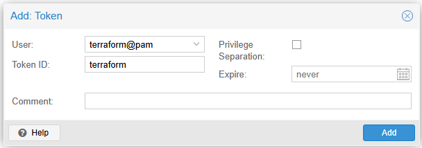 Here we are adding the token for the specific user we want to use. Note that Privilege separation is unchecked.