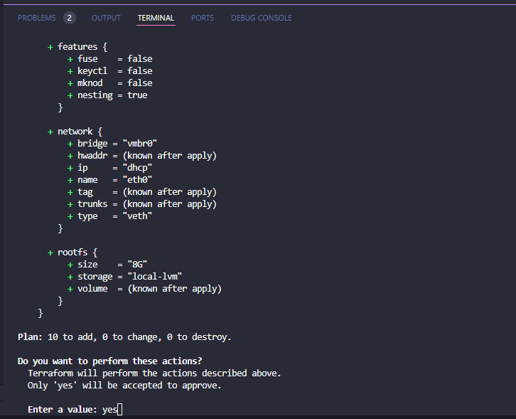 command. This will look basically like the output of the terraform plan command. However, you will need to enter yes if you want to confirm the operation to apply the state to your infrastructure.
