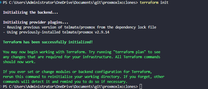 Terraform init will pull down the telmate/proxmox provider: