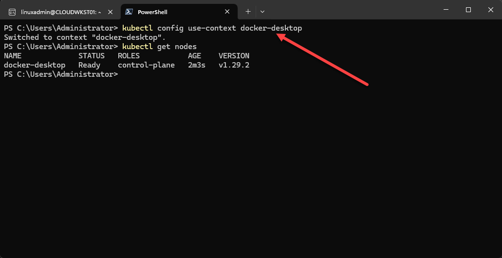 We can see after changing the context, we can run the kubectl get nodes command and see we are indeed connected to docker-desktop configuration context.