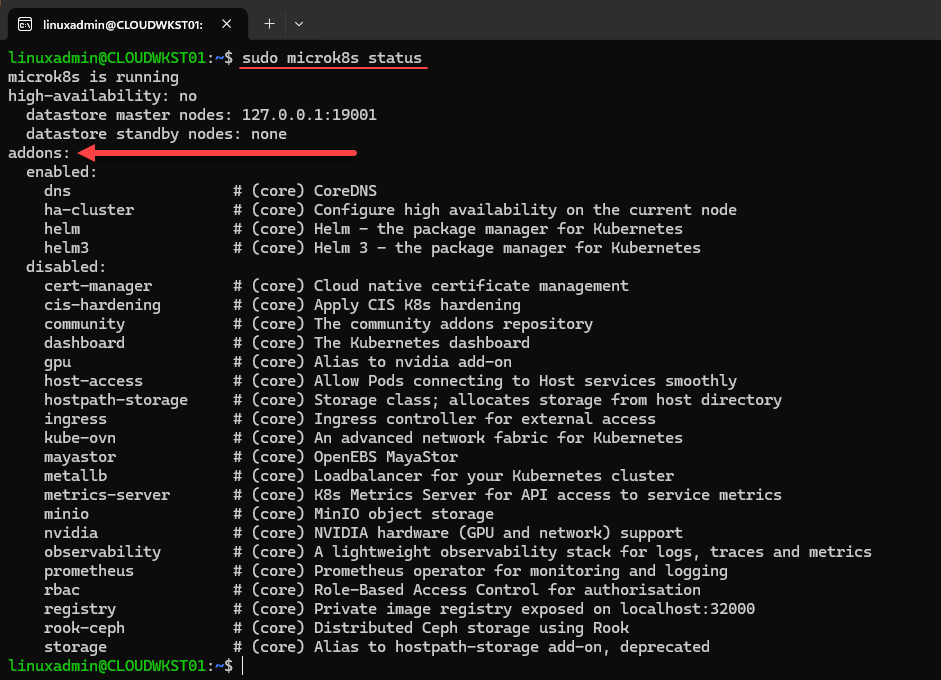 One of the great features of Microk8s is it allows you to easily install add-ons to add functionality to the Kubernetes cluster. To list the addons that are currently enabled and also list the addons that you can enable in the Microk8s cluster, use the following command:
