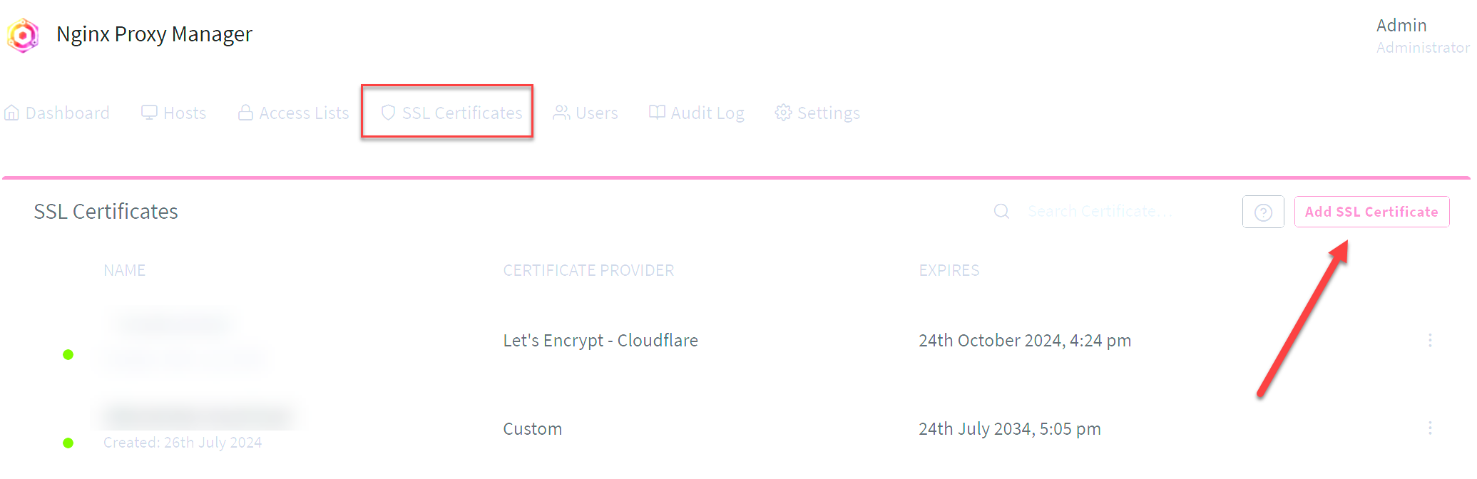 Once you have the .pem file and the .crt file, you will use these to add a new SSL certificate in NPM. Navigate to SSL certificates and click the Add SSL Certificate button.