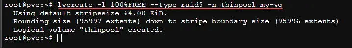Below we create the thinpool with RAID5 using all available space.