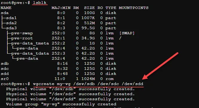 vgcreate my-vg /dev/sdb /dev/sdc /dev/sdd