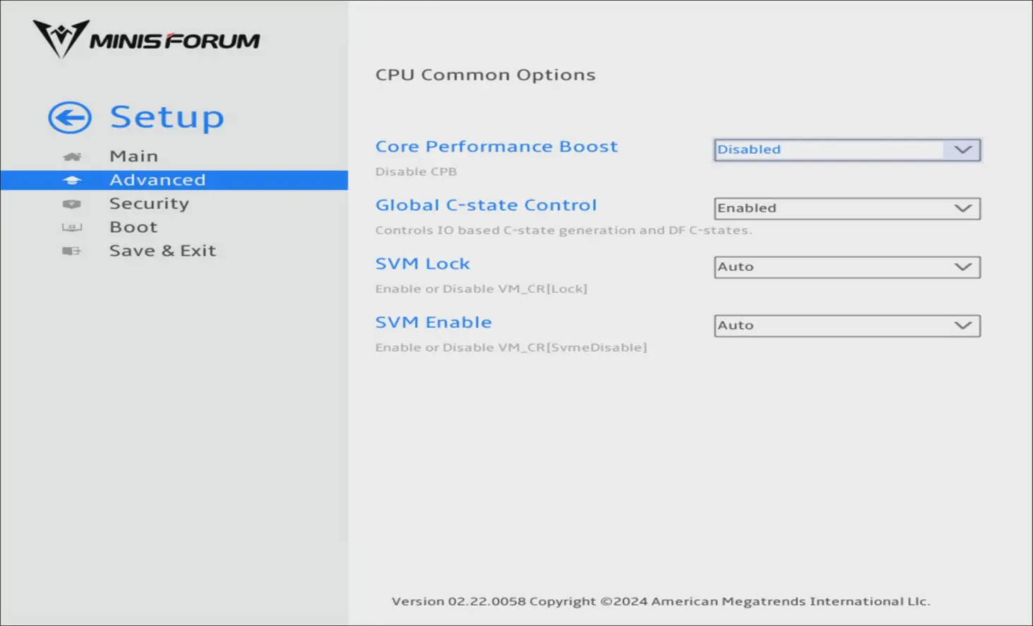 I have detailed this in my Proxmox Home Lab Server Build for 2025, but I wound up changing one setting in the CPU Common Options screen and that was Core performance Boost. With this setting Disabled, the power consumption drops literally in half. Obviously there is a bit of a performance hit with doing this as CPB allows the processor to burst the clock speed when under load.