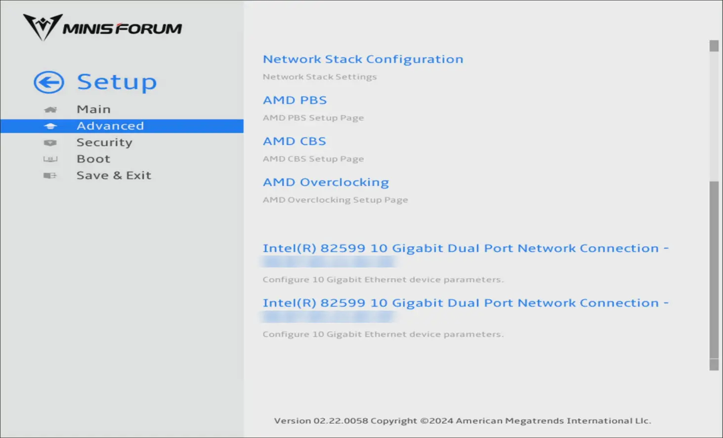 Here, I am scrolling down a little bit on the same Advanced screen. In addition, you can see the AMD Overclocking menu. Also, the 10 gig NICs are from an Intel add-in card I have installed in the system.