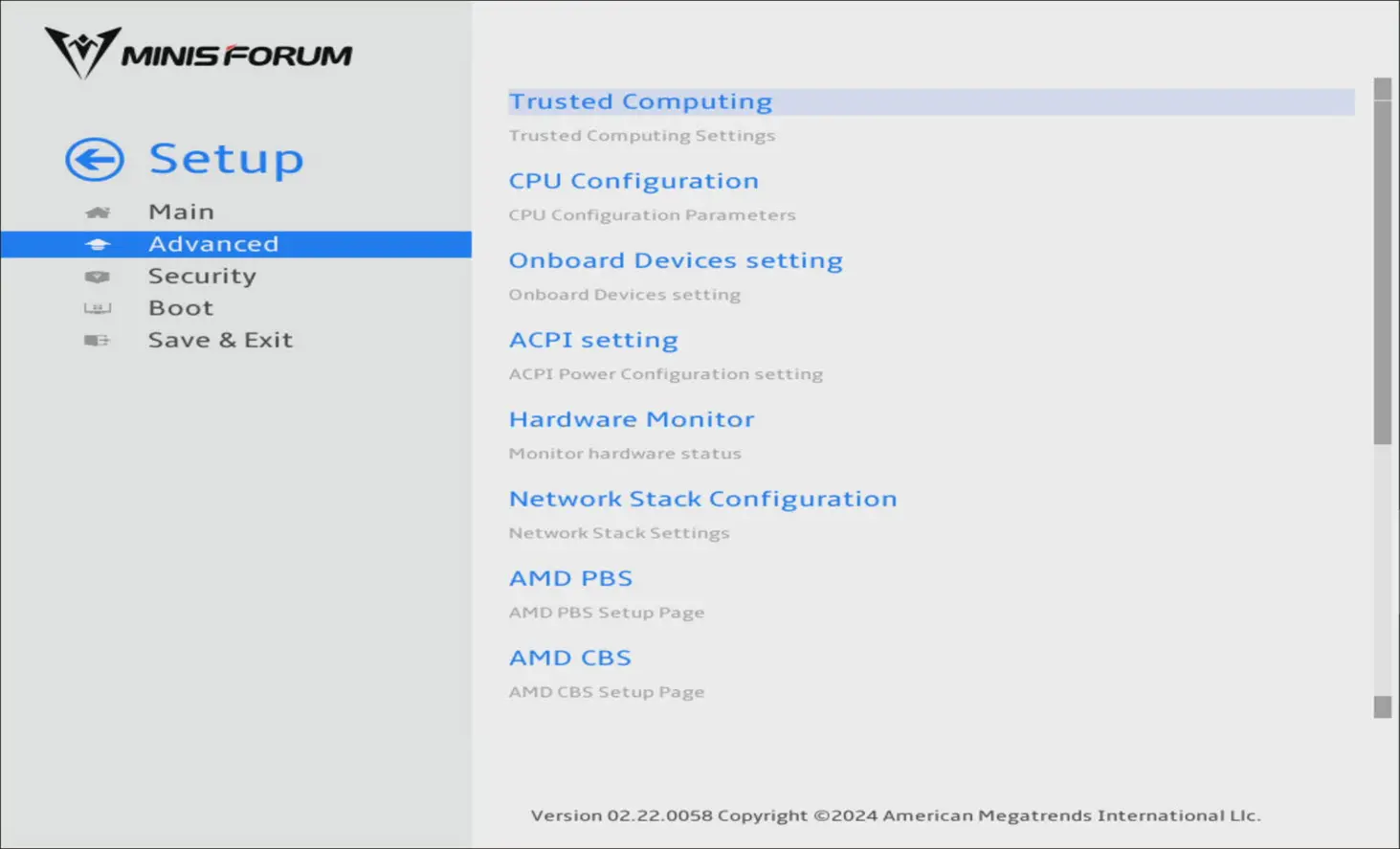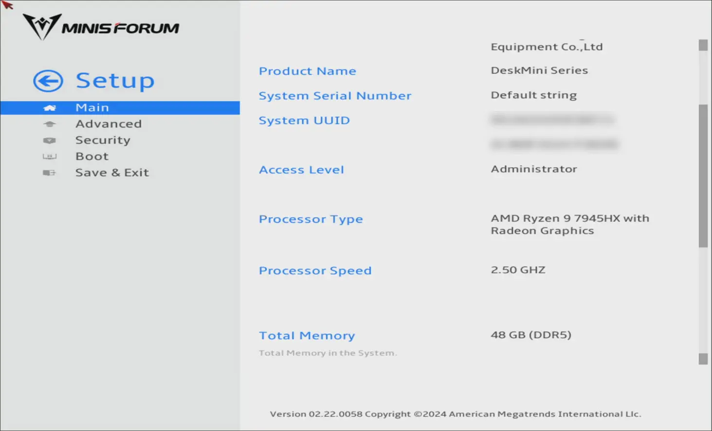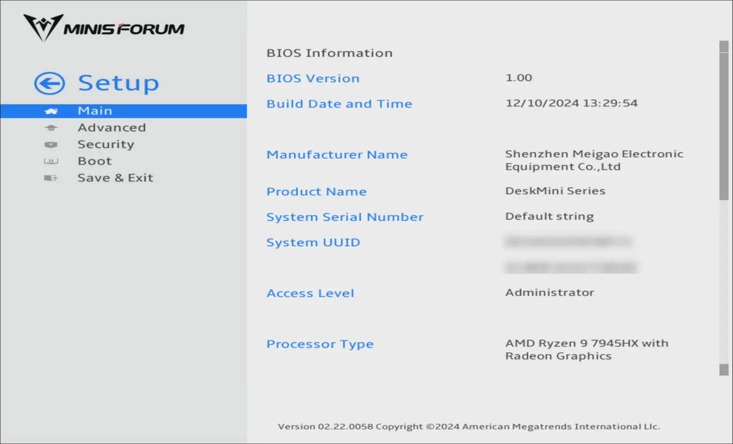 Let’s now take a look at the BD795M BIOS settings and the settings related to the AMD Ryzen 9 7945HX processor. Below is the Main screen in the BD795m BIOS. I am sitting at BIOS version 1.00.