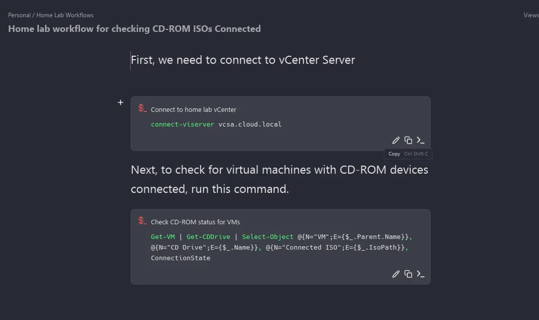 Below, you can see where this gets super powerful. You can embed workflows into your documentation and run these directly from your documentation which is extremely powerful. Think of documentation that can actually do something instead of having to read it, copy and paste, etc.