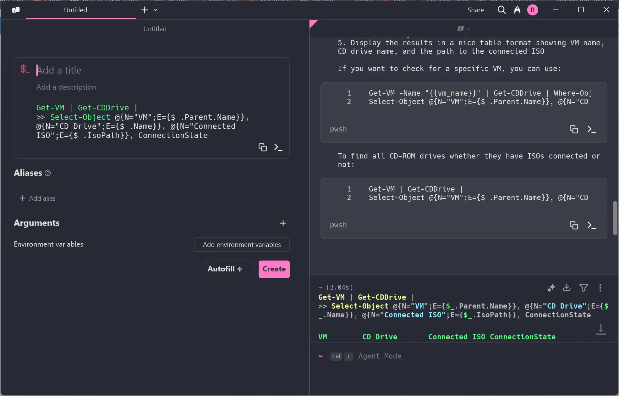 When you choose to save a code panel as a workflow, you can add a title, and then click the Create button. This will allow you to create the workflow easily from command panels as you run commands that you want to save. Maybe you worked with AI to get the command crafted perfectly. So, the workflow makes sure you don’t lose these and can reuse them in the future.