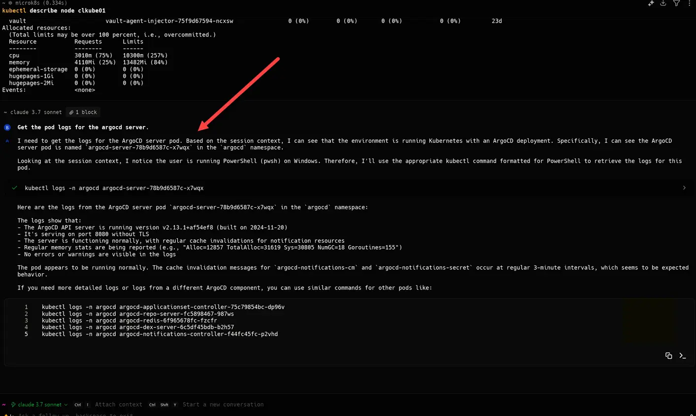 One of the really great and cool things with Warp is how it helps you in real-time troubleshoot or run the right commands that you might not “know” you need to run. Perhaps in the output of a kubectl get nodes command, you may not have noticed, but maybe one of your nodes is “NotReady”.