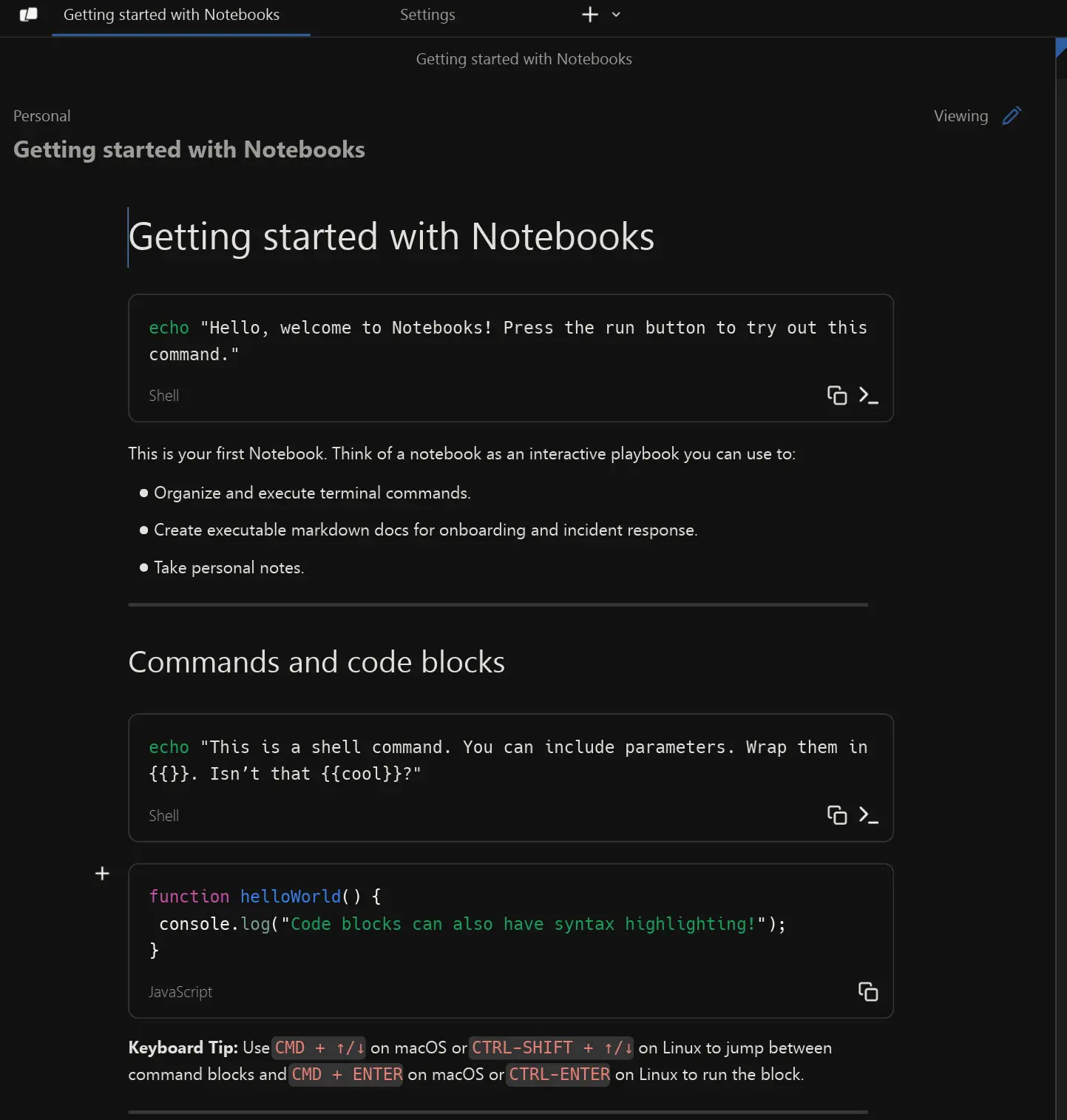 Notebooks are runnable documentation consisting of markdown text and list elements, code blocks, and runnable shell snippets that can be automatically executed in your terminal session. Notebooks are searchable and accessible through the Command Palette so you can access and run your documentation without ever leaving the terminal. You can also export Notebooks in .md format at any time.