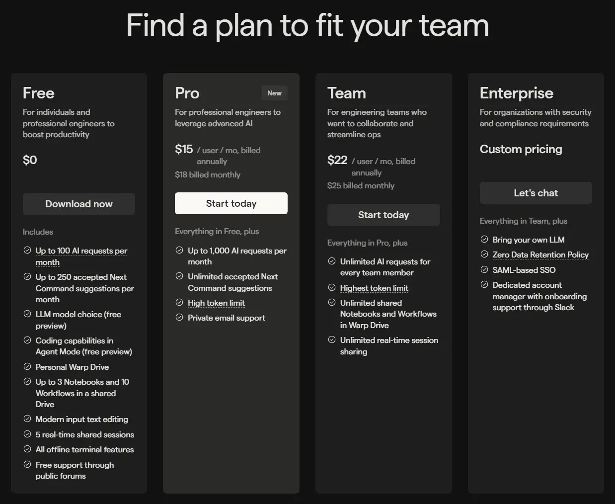 Warp is a free tool to download and use. However, there are some limits to the free tier. You get 100 AI requests per month. I figured if most use the tool to any extent throughout a week, let alone a month, you will use up the 100 AI requests. The Pro plan however, is a decent price at $15 month. I am all about open source tools, but I also think paying for tools that make life easier and more productive is worth it IMHO. And, of course you can see the more business tiers listed here as well for teams and enterprise environments.