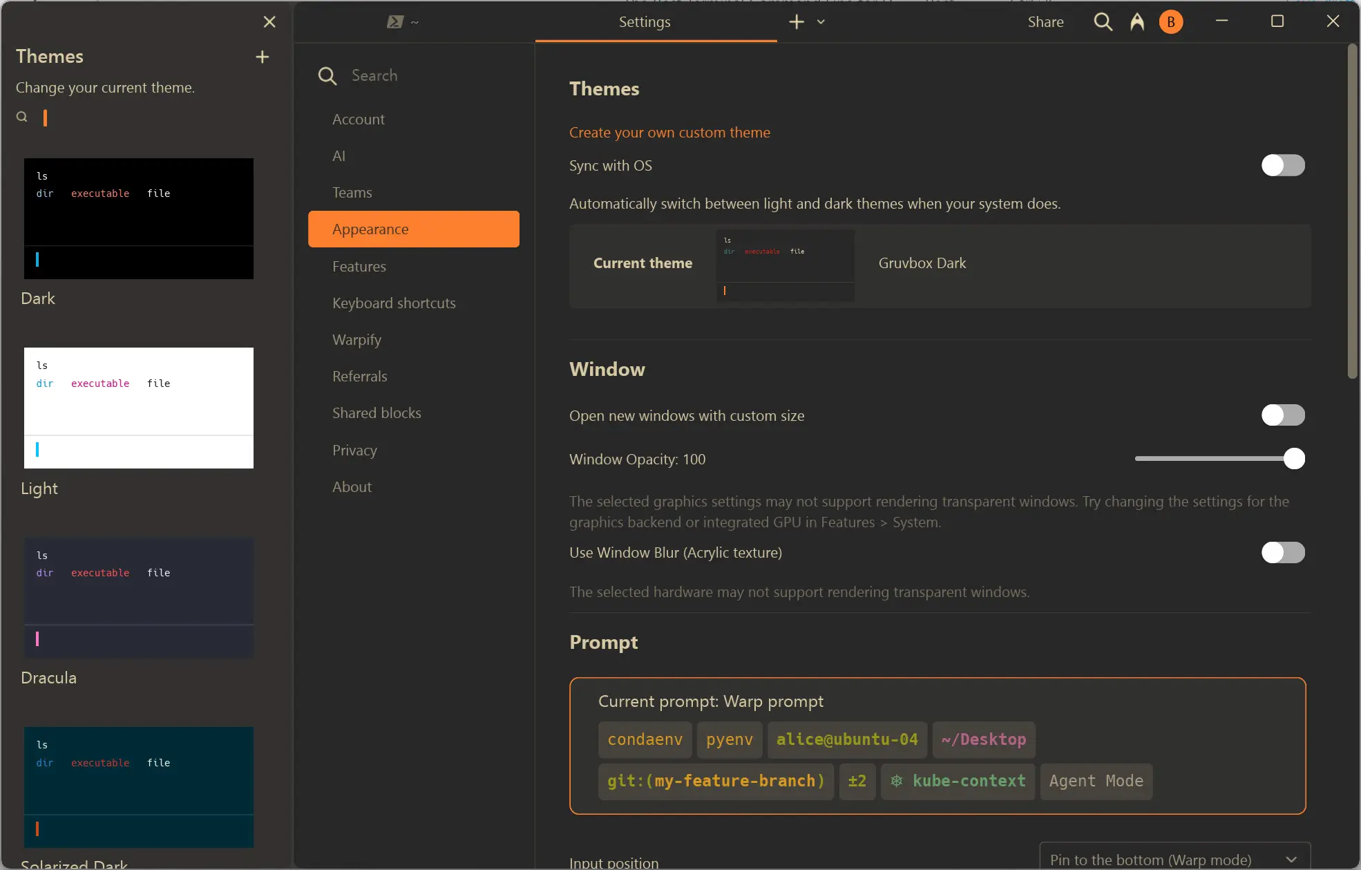 Out of the box at the time of the release, Warp Terminal also has several really nice looking themes that allow you to customize the look and feel of your Warp terminal. The default theme is very high contrast and looks good, but there are many others to choose from.