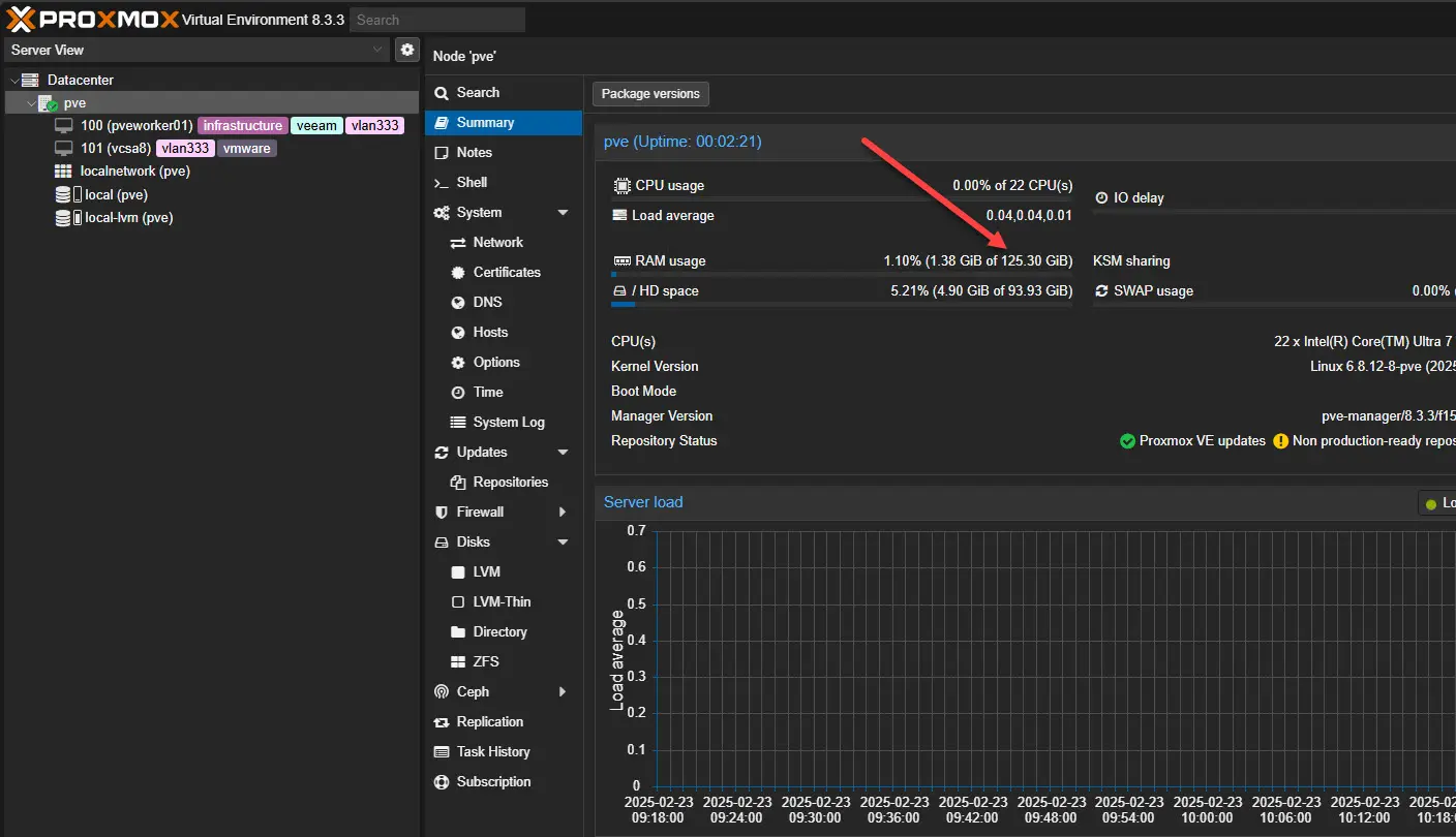 After installing the 128 GB kit inside the ASUS NUC 14 Pro on a drive with Proxmox installed, Proxmox booted up and showed the new 128 GB kit system memory. This will make the ASUS NUC 14 Pro a highly desirable mini PC for home labbing with the combination of hardware specs that it already has and now the possibility of increased memory limits.