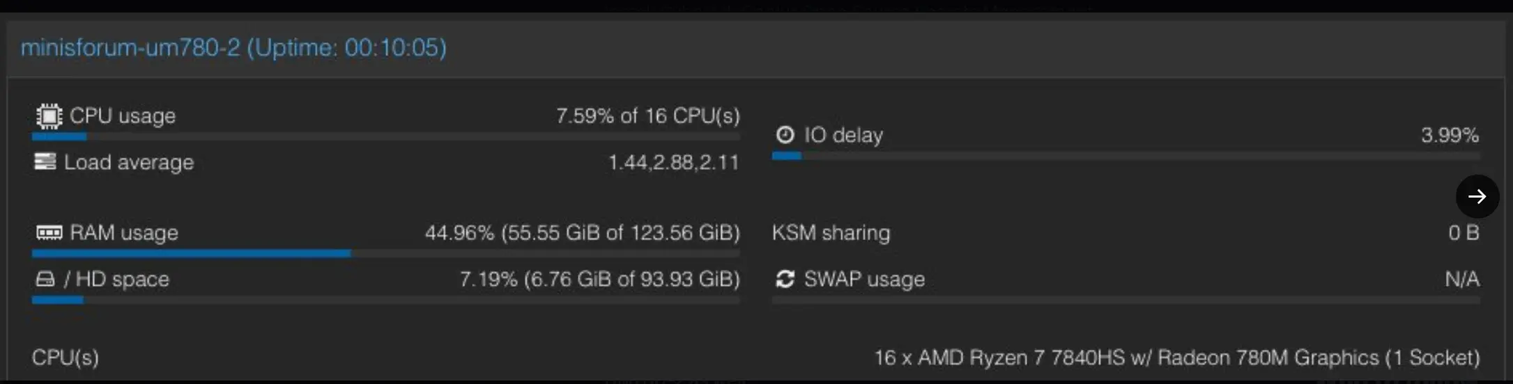 This is one that I haven’t tested personally. However, that is one thing I love about the community is sharing knowledge and information with one another. Doug Burks, @dougburks on “X” reached out and mentioned he received his 128 GB kit in and installed in his Minisforum UM780 and it was correctly reading all the memory as you can see from his screenshot in Proxmox below.