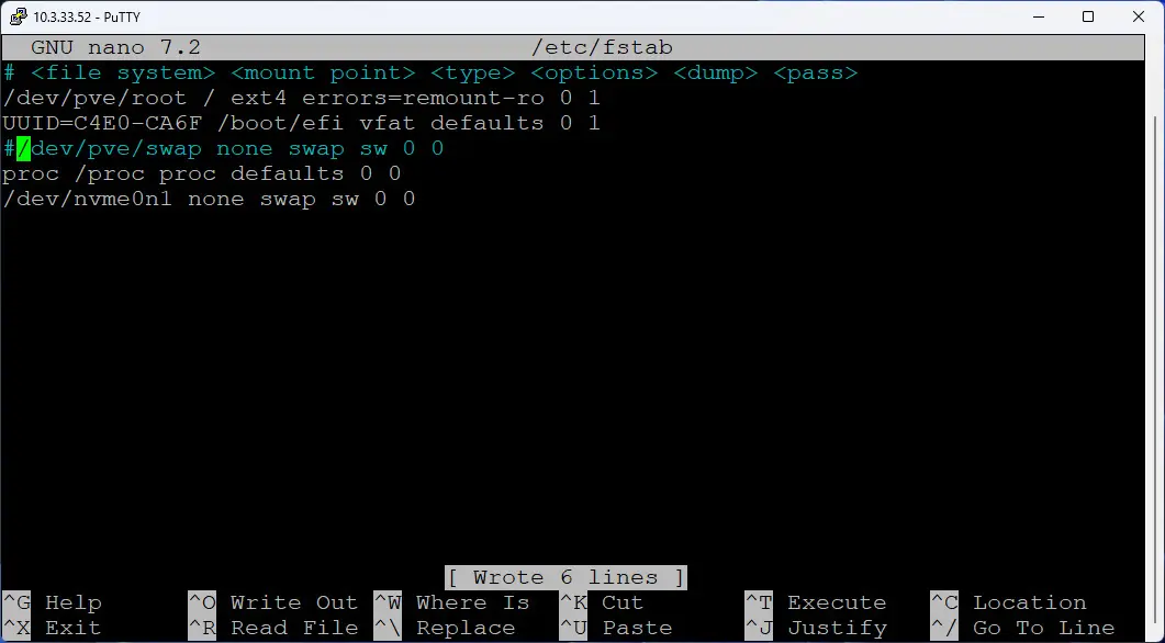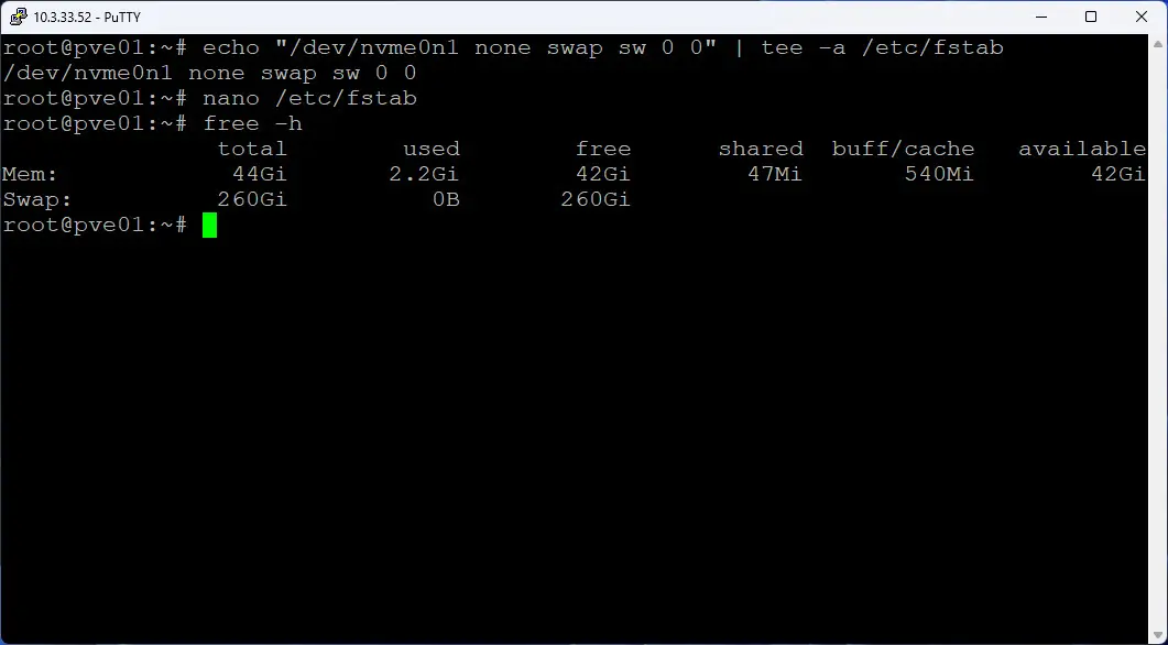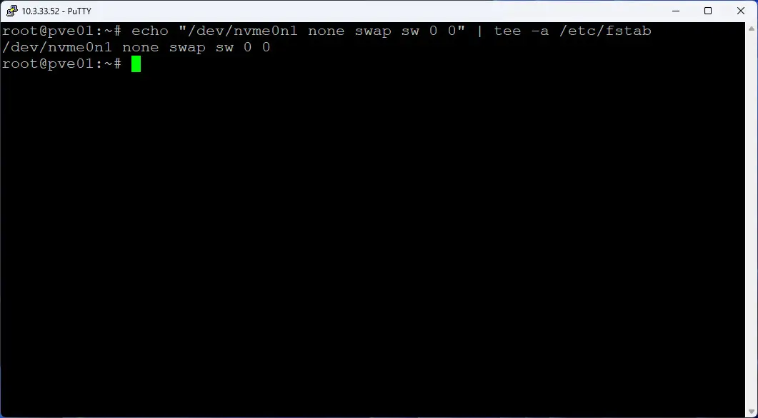 echo "/dev/nvme0n1 none swap sw 0 0" | tee -a /etc/fstab