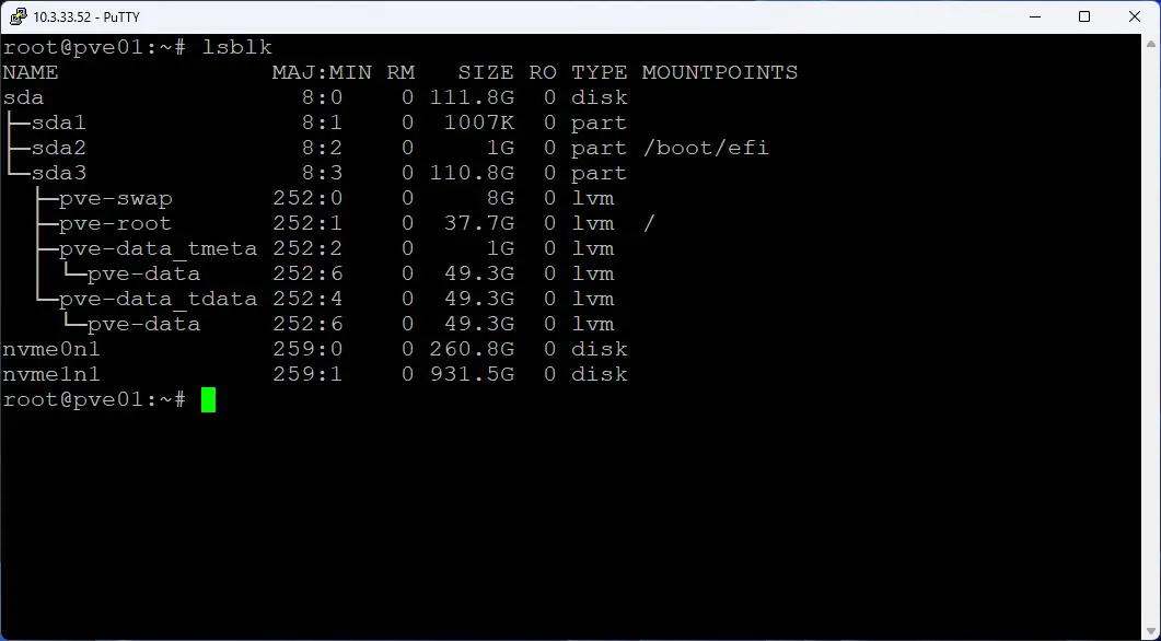 As you can see below, we see the default 8 GB partition that is configured when we install Proxmox. This will use the same disk that your Proxmox installation uses.