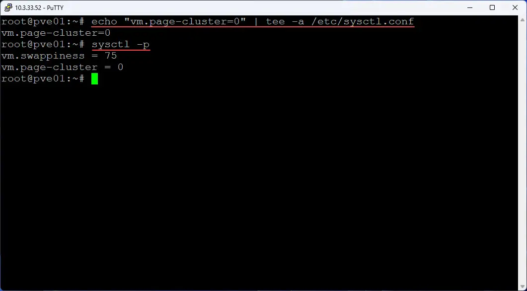 The vm.page-cluster setting in Proxmox controls how many pages (which are 4kb in size each) the Linux kernel tries to read and write to your swap space at once. The default value is 3 which means Linux will swap in and out 2^n pages (2^3 which equals 8 pages at a time). Optane can handle high IOPS efficiently and doesn’t need this batching operation due to its performance